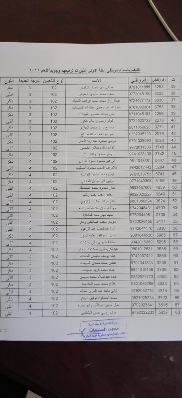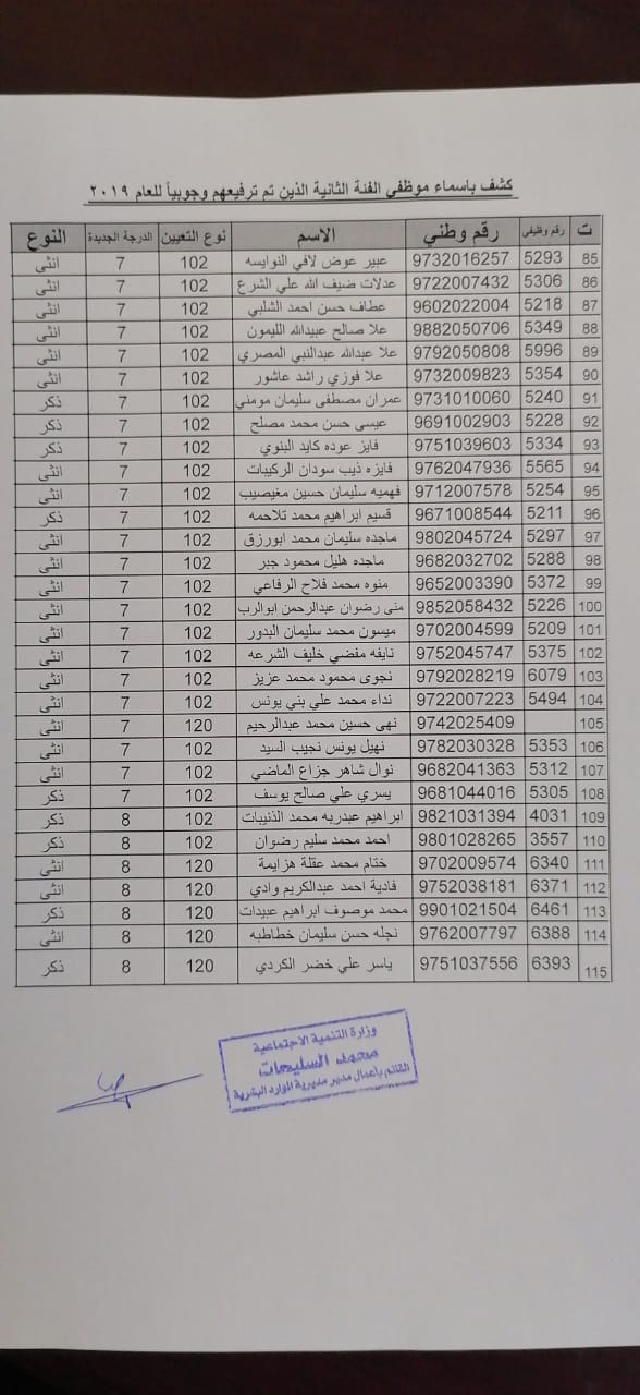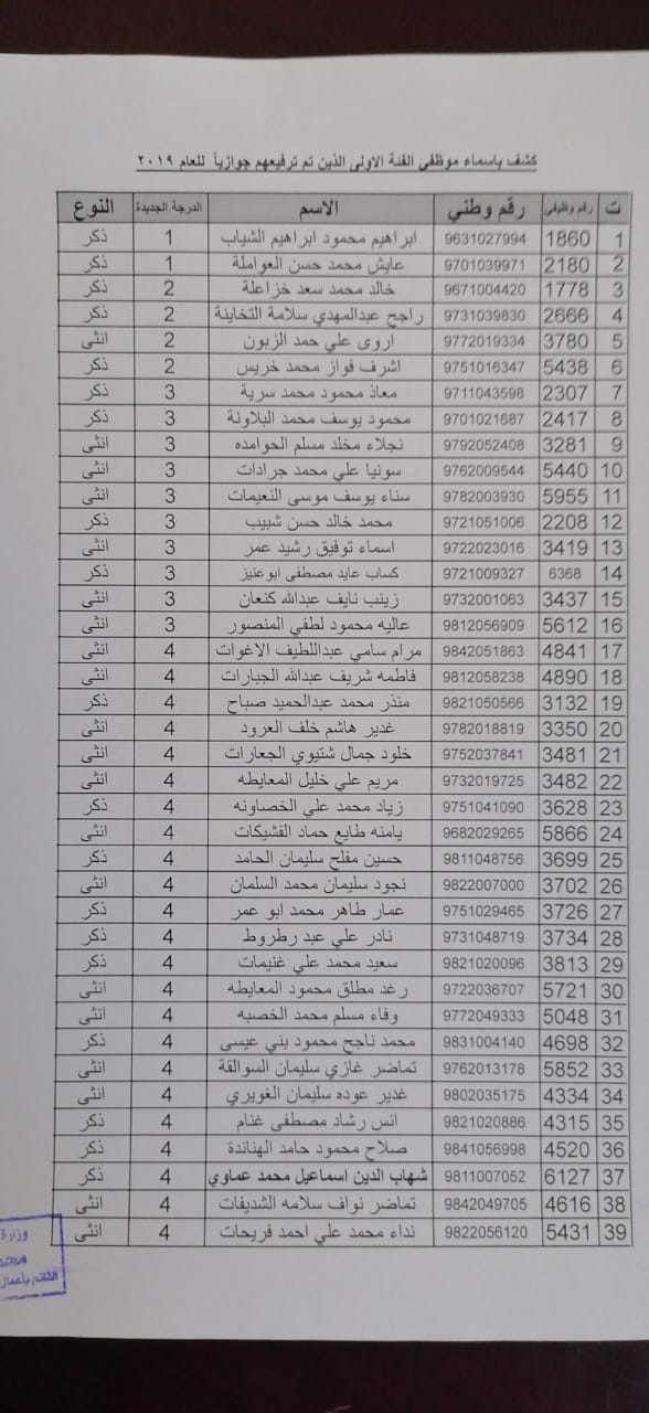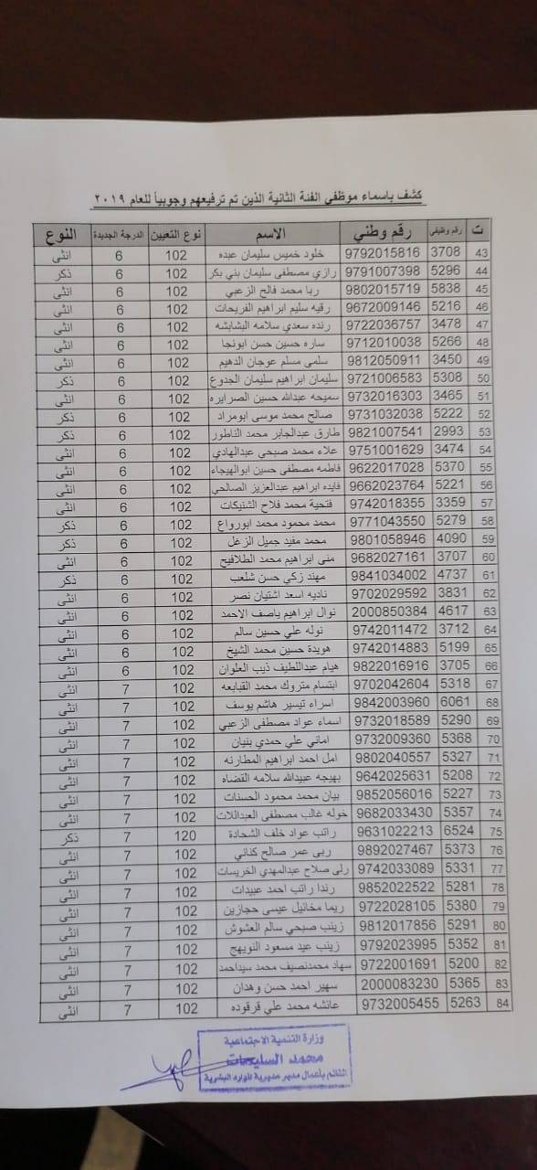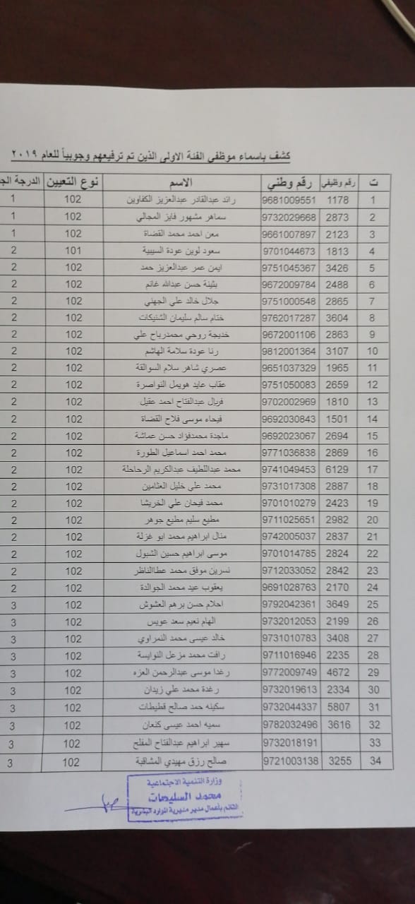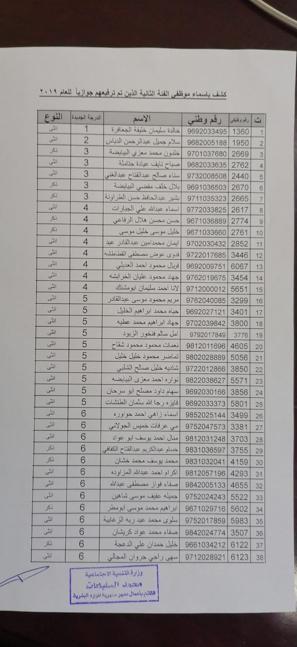 قررت وزير التنمية الاجتماعية ترفيع (375) موظفاً من الفئتين الاولى والثانية ترفيعاً وجوبياً وجوازياً الى الدرجات التي يستحقونها و جاء قرار الوزير وفق احكام نظام الخدمة المدنية الساري المفعول واستنادا الى قرار لجنة الموارد البشرية ، يذكر ان مديرية الموارد البشرية في وزارة التنمية الاجتماعية قد نفذت حوالي (190) برنامجاً تدريبياً خلال عام 2019 استفاد منه ما يزيد عن 2200 موظف.