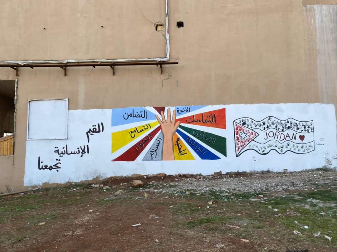 ضمن انشطة مشروع افاق جديدة في محافظة مأدبا المنفذ من قبل المعهد الملكي للدراسات الدينية و بالشراكة مع مؤسسة شباب42 ، قام اعضاء المبادرة ومجموعة من المتطوعين في محافظة مأدبا رسم ( جدارية )تهدف الى ترسيخ القيم الانسانية.