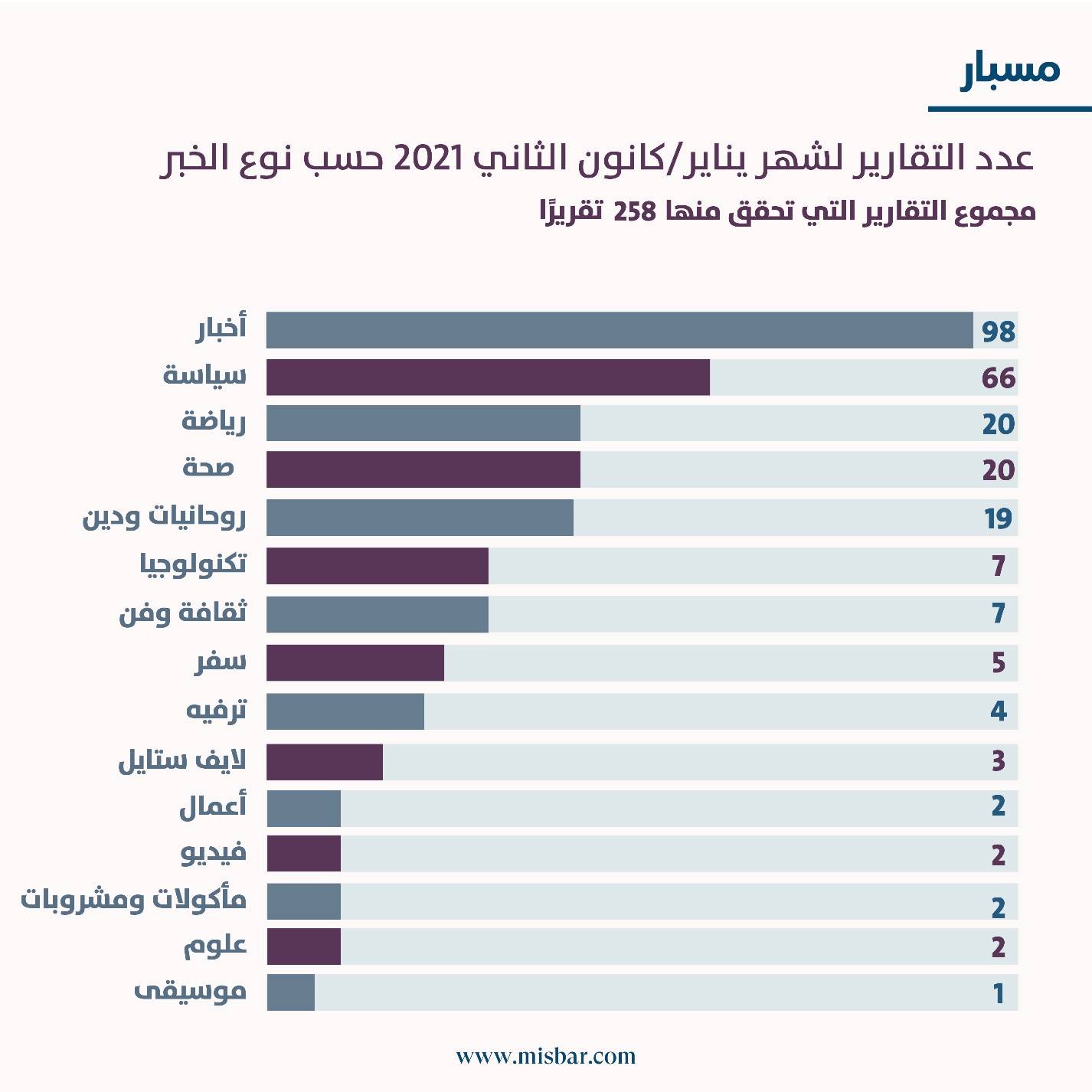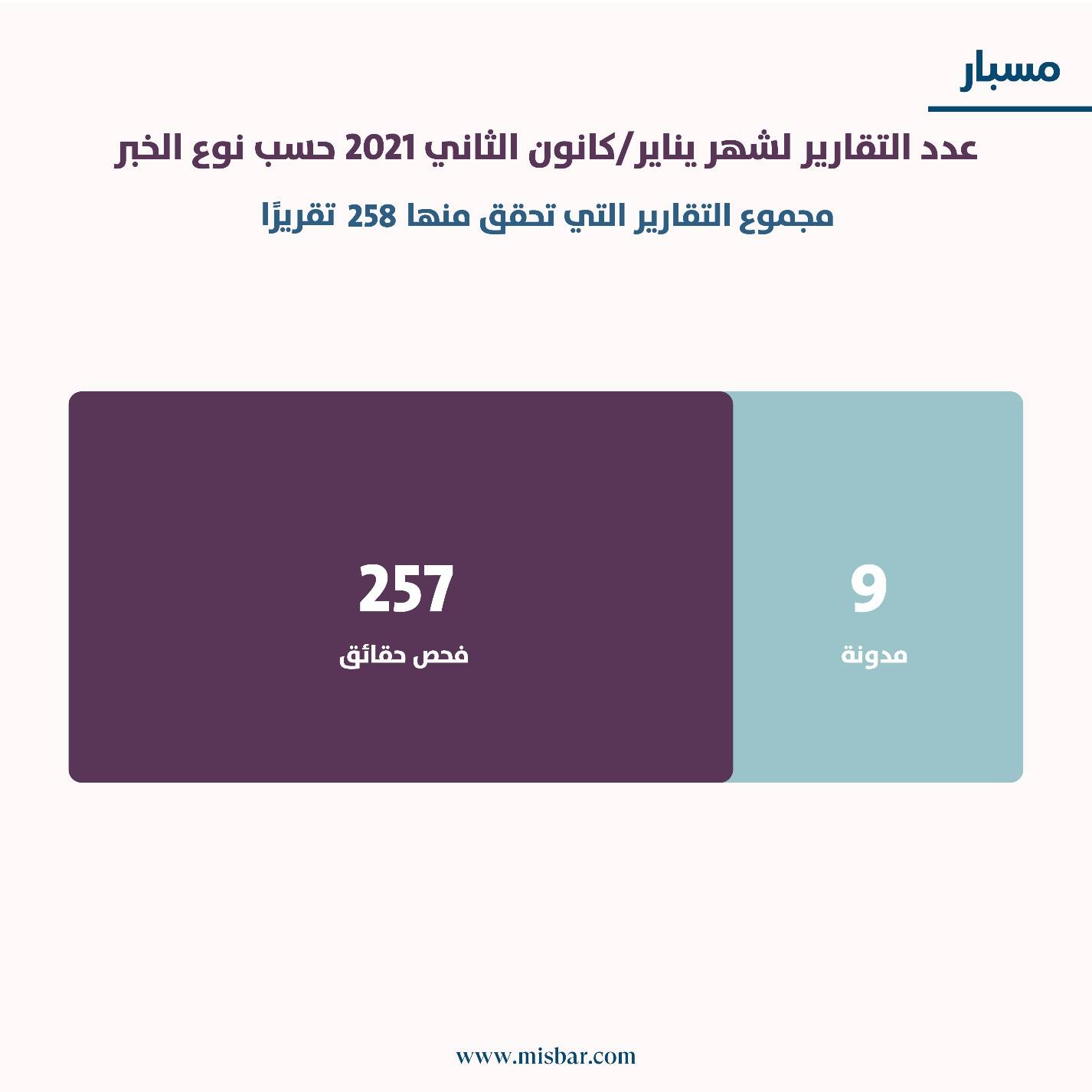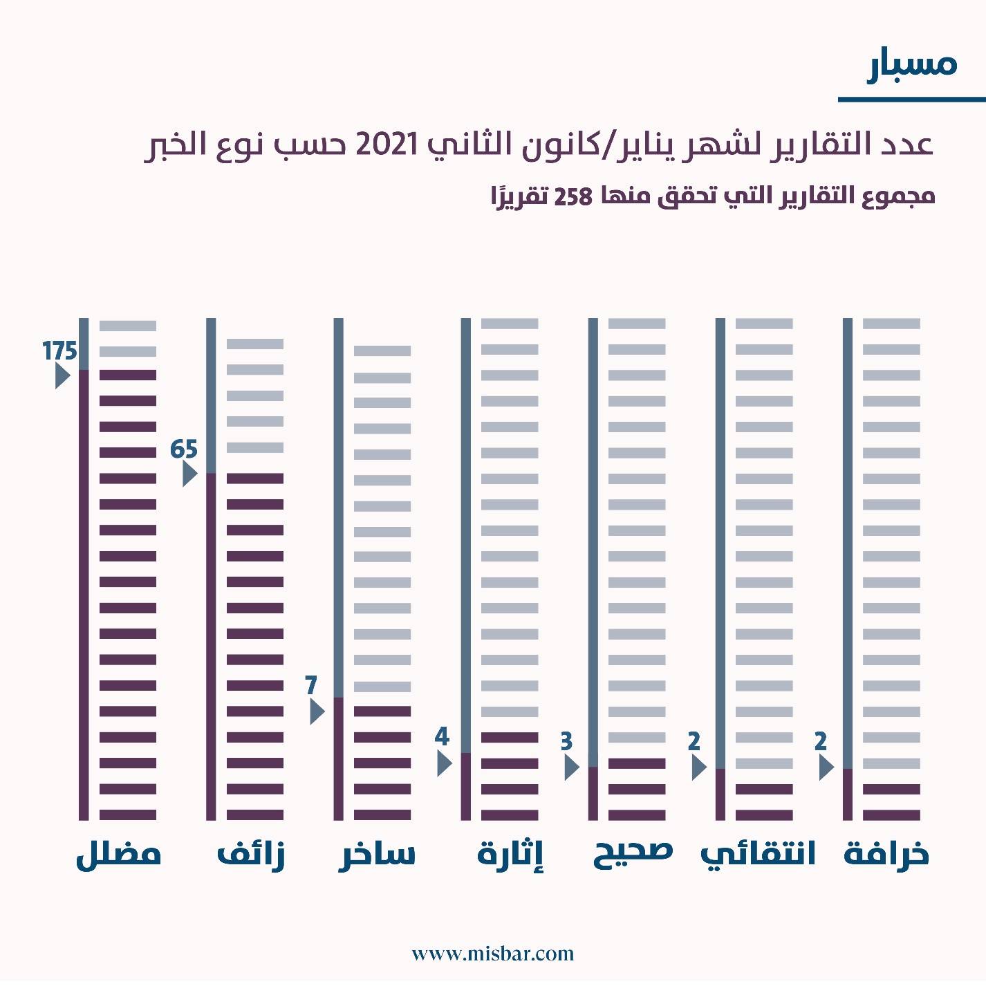 بيان للإعلام 7 شباط 2021- في أوّل مؤشّر لعام 2021، افتتح "مسبار" العام الجديد بالتحقق من 258 خبرًا ومنشورًا في الفضاء الرقمي في شهر يناير/كانون الثاني من العام الجاري، كما هو موضّح في الشكل رقم (1) أدناه، والّذي رافقته أحداث ووقائع عالمية وعربية وفق التصنيفات المُعتمدة المُختلفة، والتي تتراوح بين الأخبار الزائفة، والمضلّلة والانتقائية والساخرة، إذ نالت الأخبار المضلّلة الحصّة الأكبر، وعددها 175 خبرًا، ضمن تحقيقات فريق العمل والمساهمين في "مسبار"، تلتها الأخبار الزائفة وعددها 65 خبرًا، كما تحقّق "مسبار" من 7 أخبار ساخرة، و 4 أخبار وعناوين تحتوي على إثارة، وخبرين تم تداولهم بشكلٍ انتقائي، كما هو موضّح في الشكل رقم (2) أدناه.