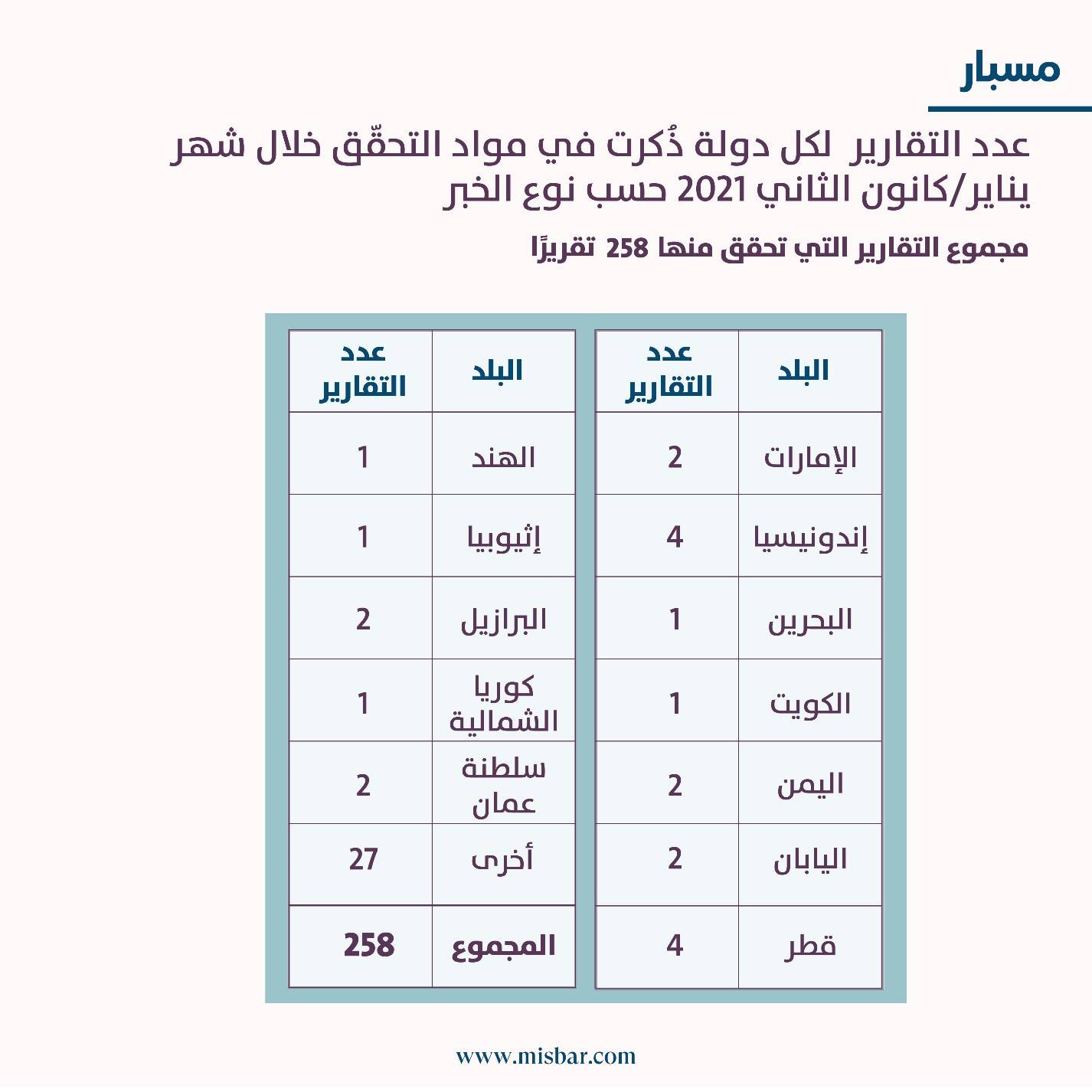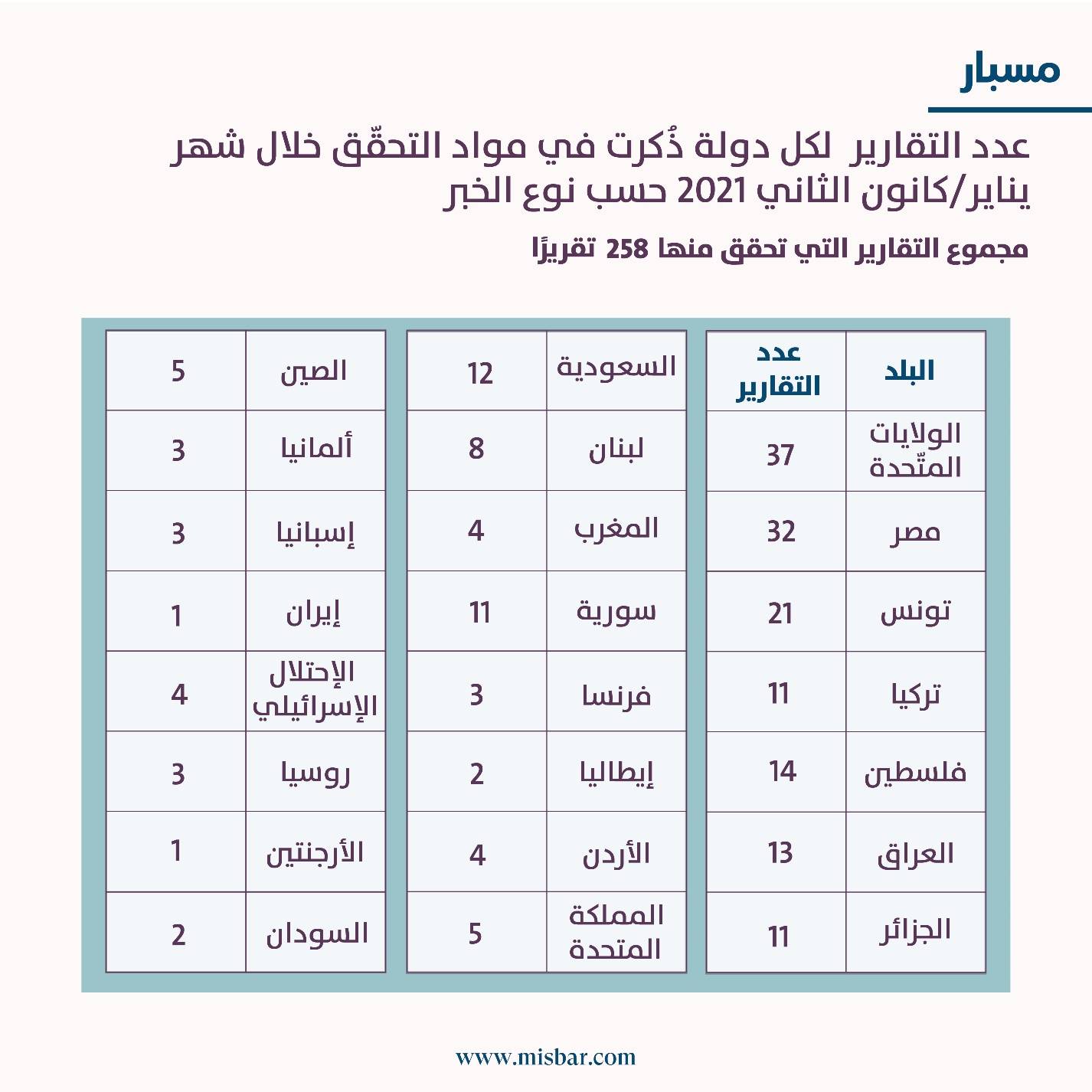 أمّا من حيث توزيع الأخبار على الخارطة العالمية، فقد نالت التحقيقات من الأخبار المتعلّقة بالولايات المتّحدة الأميركية الحصّة الأكبر، ولربّما يعود ذلك لتنصيب الرئيس الأميركي جو بايدن بشكلٍ رسميٍّ ولأحداث اقتحام مبنى الكونغرس هناك، حيث وصل عددها إلى 37 خبرًا، تليها الأخبار المتعلّقة بمصر، وعددها 32 خبرًا، كما حصلت الأخبار التي تدور حول تونس إلى 21 خبرًا، وذلك يعود لاندلاع الاحتجاجات هناك مؤخّرًا، كما كان عدد الأخبار المتعلّقة بفلسطين والّتي تحقق منها "مسبار" 14 خبرًا، تليها العراق، وعددها 13 خبرًا، وتركيا والجزائر وسوريا، وعدد الأخبار المتعلّقة بكلّ منها 11 خبرًا، كما هو موضّح في الشكل رقم (4) أدناه.