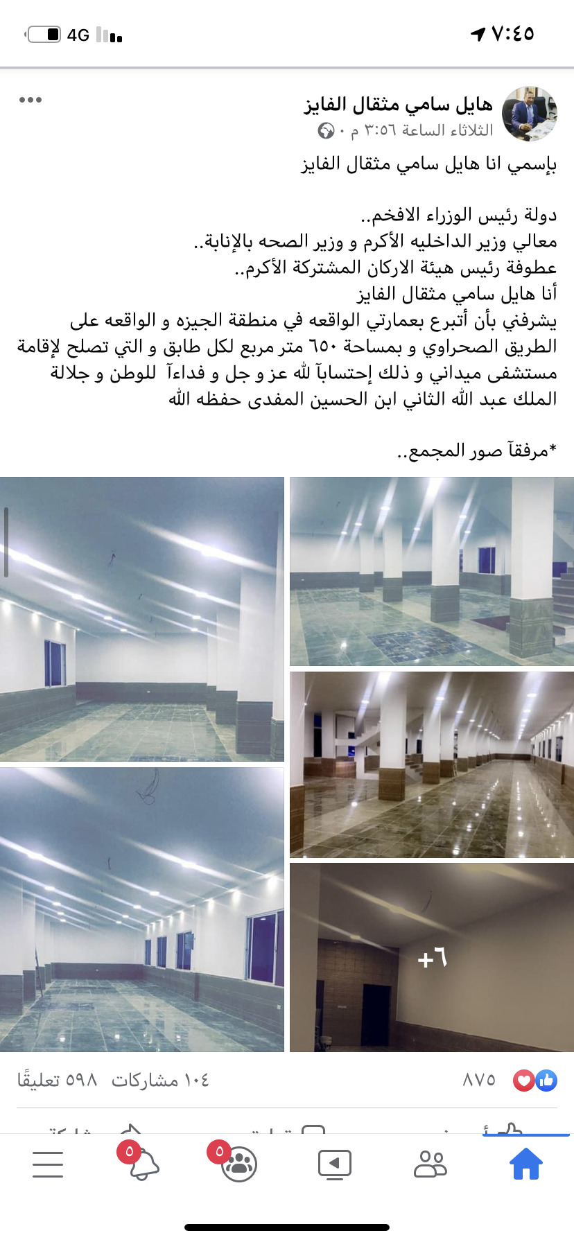يشرفني بأن أتبرع بعمارتي الواقعه في منطقة الجيزه و الواقعه على الطريق الصحراوي و بمساحة ٦٥٠ متر مربع لكل طابق و التي تصلح لإقامة مستشفى ميداني و ذلك إحتسابآ لله عز و جل و فداءآ للوطن و جلالة الملك عبد الله الثاني ابن الحسين المفدى حفظه الله