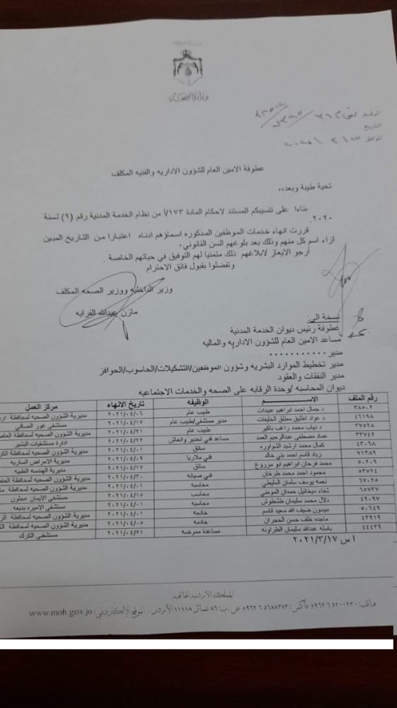 الفراية ينهي خدمات 14 موظف في وزارة الصحة... اسماء
