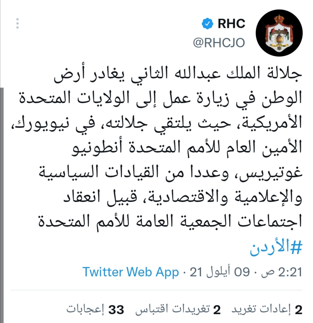 ويلتقي جلالته، في نيويورك، الأمين العام للأمم المتحدة أنطونيو غوتيريس، وعددا من القيادات السياسية والإعلامية والاقتصادية، قبيل انعقاد اجتماعات الجمعية العامة للأمم المتحدة .