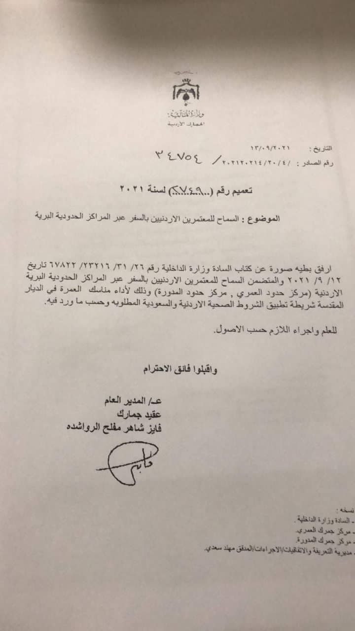 كشف مصدر، أن وزارة الداخلية قد قررت السماح للأردنيين بالسفر عبر المراكز الحدودية البرية الأردنية-السعودية (مركز حدود العمري، ومركز حدود المدورة)، لأداء مناسك العمرة.