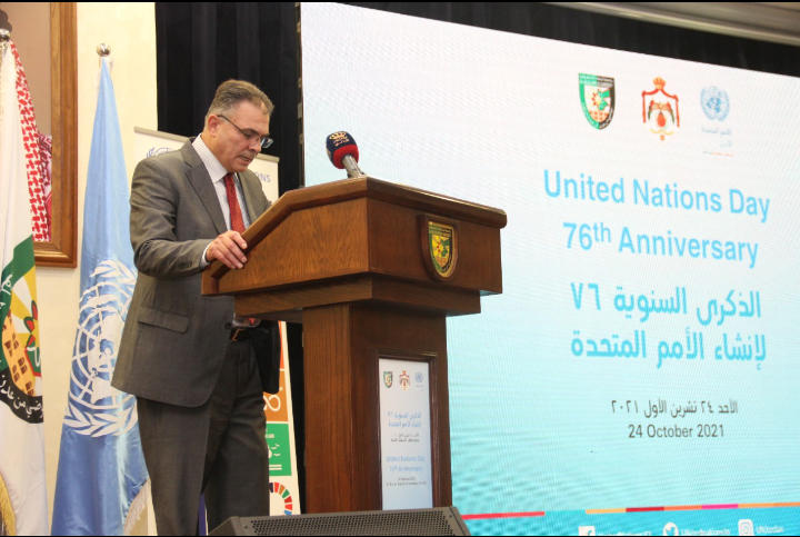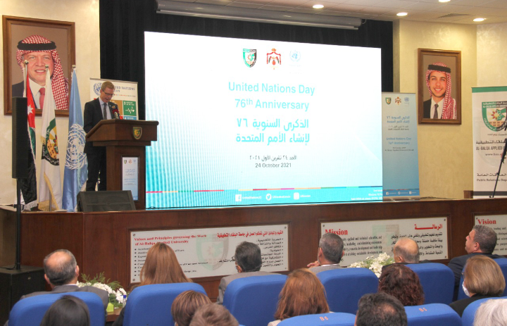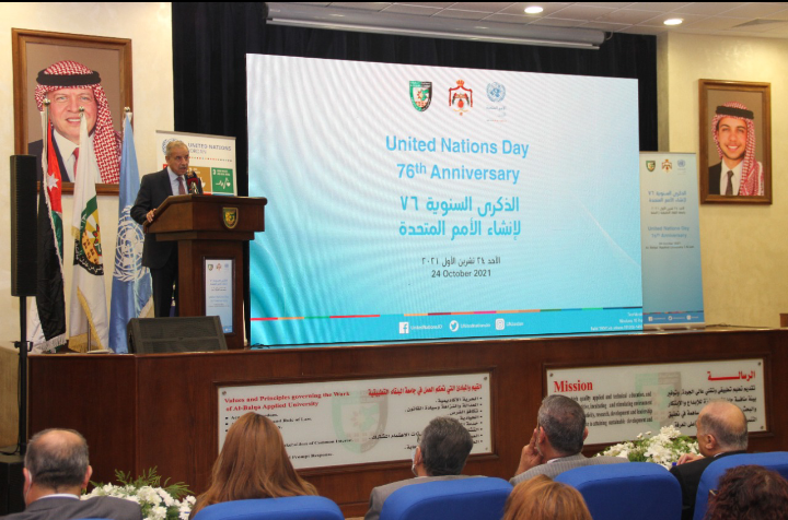 نظم فريق الأمم المتحدة في الأردن اليوم بالتعاون مع جامعة البلقاء التطبيقية والتنسيق مع وزارات السياحة والزراعة والبيئة فعالية علمية بمناسبة الذكرى السادسة والسبعين لانشاء الأمم المتحدة وعرض السياسات الوطنية المرتبطة بالتغير المناخي برعاية ضيف الشرف نائب رئيس الوزراء ووزير الإدارة المحلية معالي السيد توفيق كريشان وحضور رئيس جامعة البلقاء التطبيقية الأستاذ الدكتور عبدالله سرور الزعبي ومعالي الدكتور جواد العناني رئيس مجلس أمناء الجامعة وعطوفة محافظ البلقاء الدكتور فراس ابو قاعود وسعادة السيد اندريس بيدرسون المنسق المقيم للأمم المتحدة في الأردن وعدد من سفراء الدول الصديقة ونواب رئيس جامعة البلقاء التطبيقية.