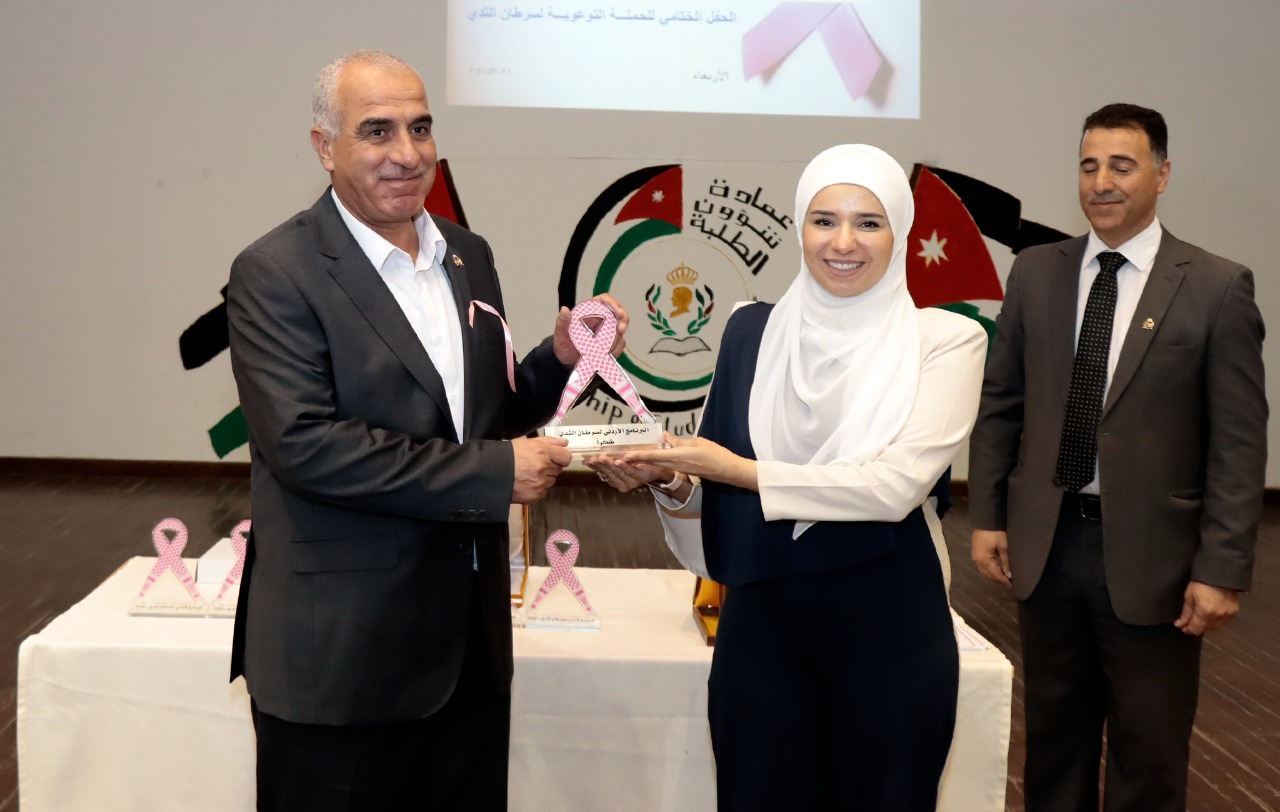 تحت رعاية رئيس جامعة الحسين بن طلال الأستاذ الدكتور عاطف الخرابشة أقيم على مسرح عمادة شؤون الطلبة الحفل الختامي للبرنامج الأردني لسرطان الثدي (تصورتي)، والذي يهدف الى توعية السيدات ونشر ثقافة الفحص الذاتي المبكر بين الطالبات وكادر الجامعة والمجتمع المحلي، وبحضور عميد شؤون الطلبة الدكتور بشير كريشان.