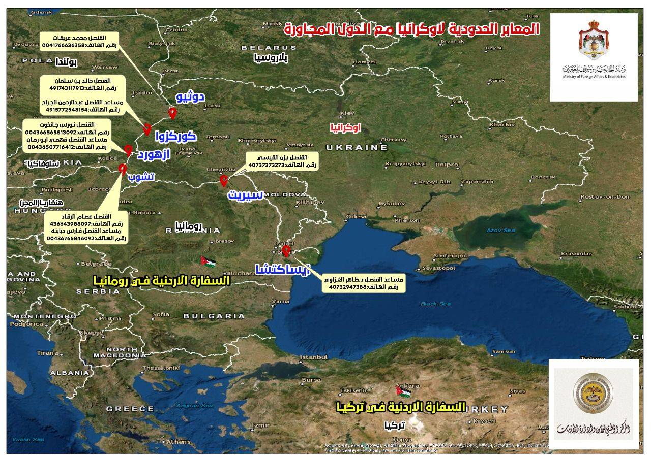 إعلان هام: في ضوء التطورات في أوكرانيا، حدّدت وزارة الخارجية وشؤون المغتربين المعابر والنقاط الحدودية مع أوكرانيا والتي يتواجد فيها القناصل وموظفي السفارات وأسمائهم وأرقام التواصل معهم على النحو المبين أدناه: