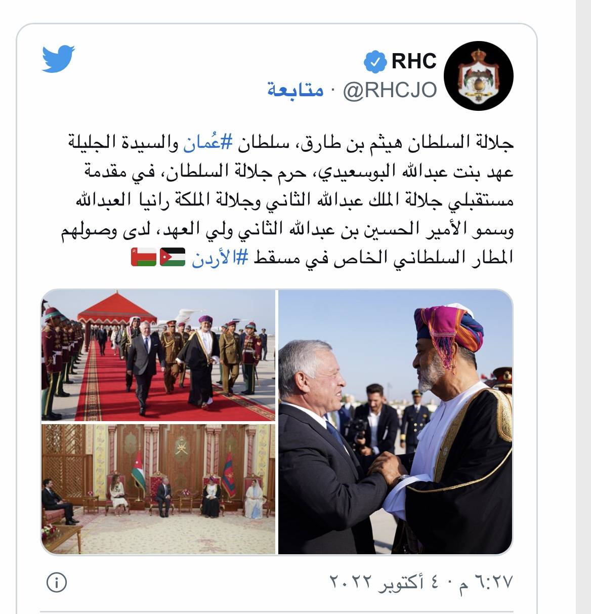 من جهته، أعرب جلالة السلطان هيثم بن طارق عن ترحيبه بزيارة جلالة الملك والوفد المرافق إلى سلطنة عُمان، مؤكدا عمق العلاقات الأخوية التي تربط الأردن وسلطنة عُمان وشعبيهما الشقيقين.